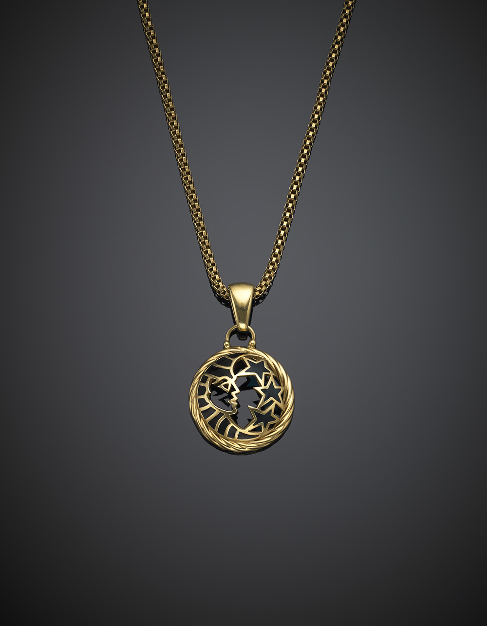Catena in oro giallo come il pendente a guisa di luna rifinito in smalti, g 18,36, lungh. cm 60 circa. La catena firmata Unoaerre.