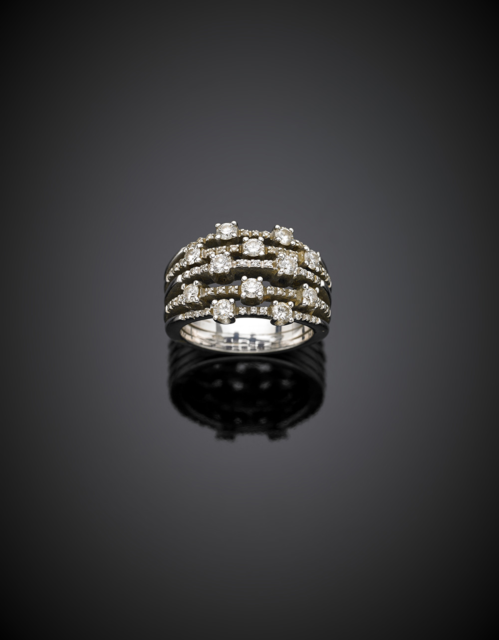 Anello in oro bianco a cinque fedine rifinite in diamanti per complessivi ct. 1 circa, g 13,35 misura 14/54.