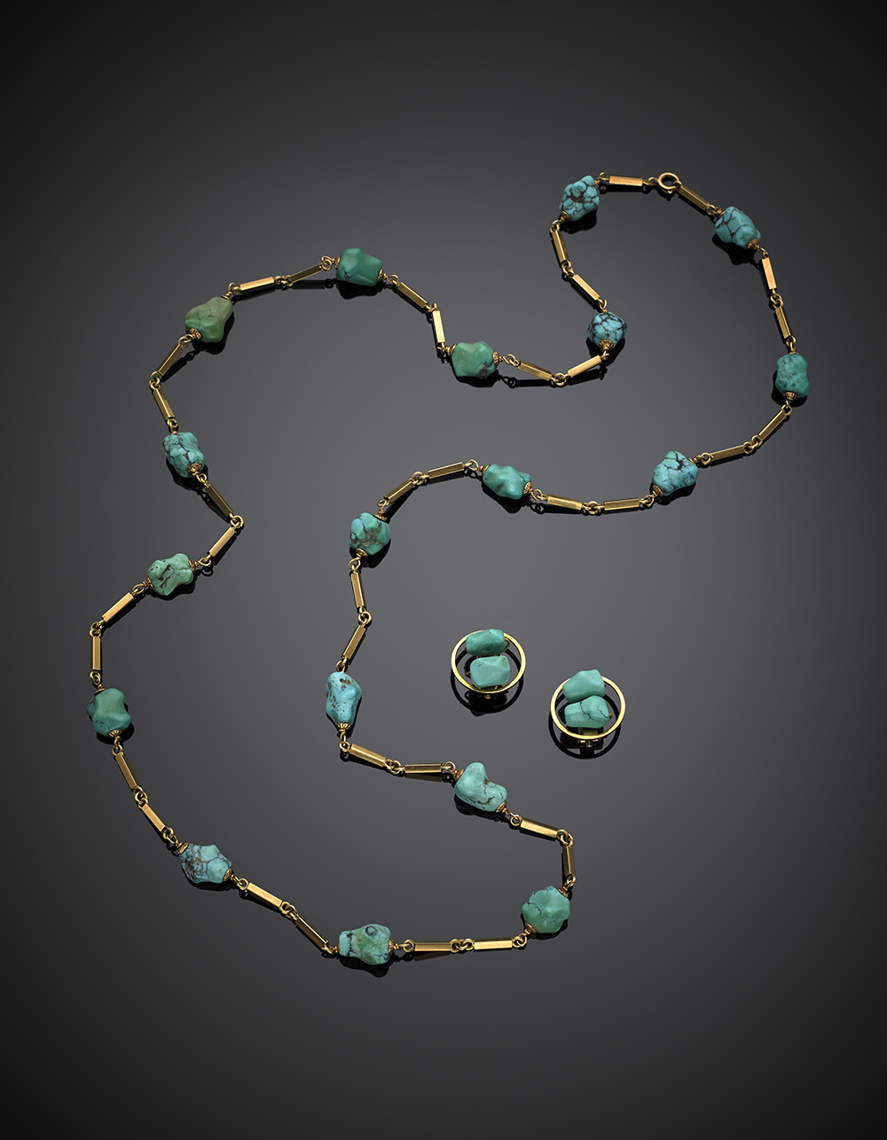 Demi-parure in oro giallo e turchesi politi a sasso, composta da collana ed orecchini, complessivi g 58,65, lungh. cm 97 circa.