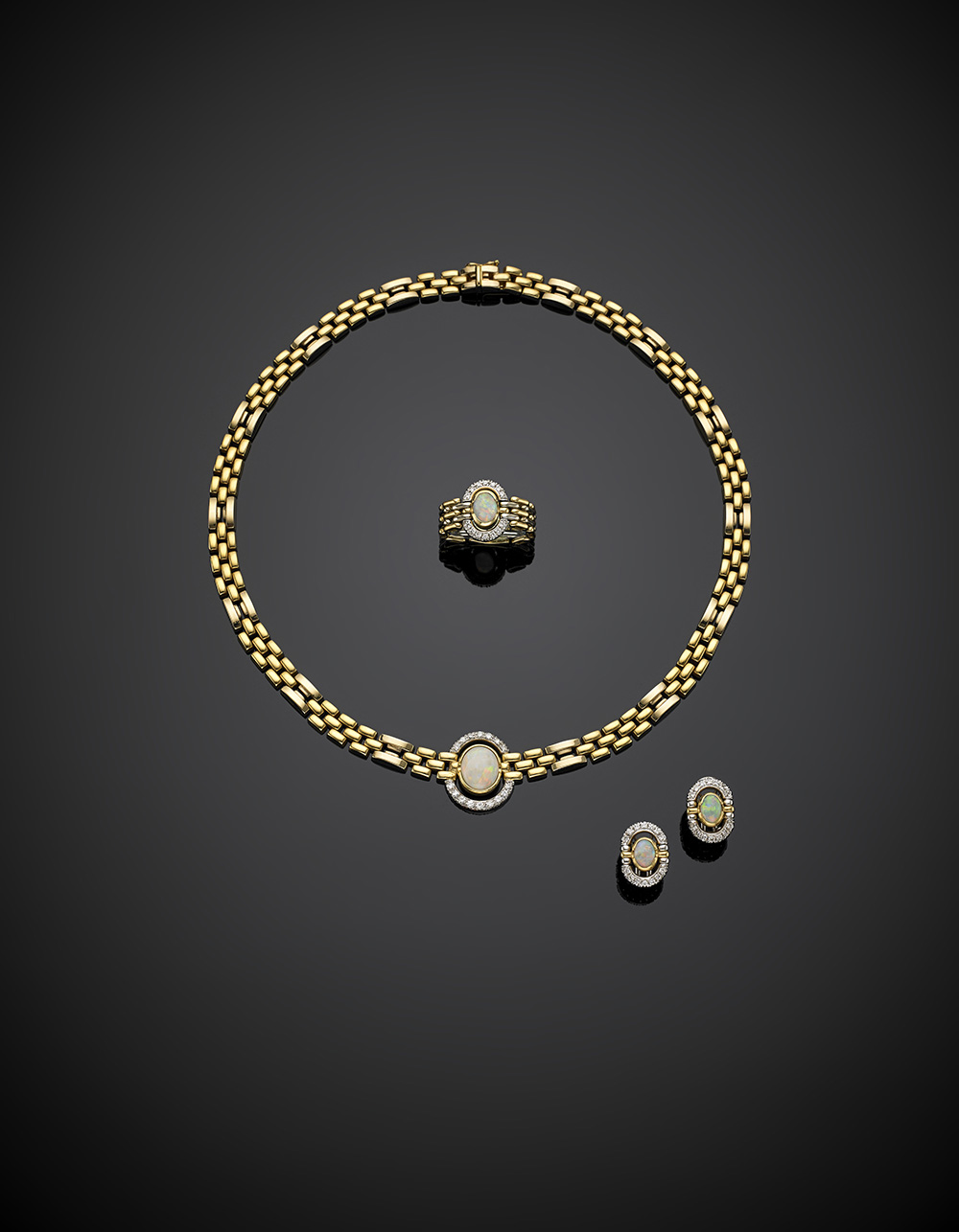 Demi parure in oro giallo e bianco, diamanti rotondi e opali ovali composta da collier a catena, anello a maglia morbida e orecchini a lobo, lungh. collier cm 43,5 circa,complessivi g 64,18 misura 14/54.