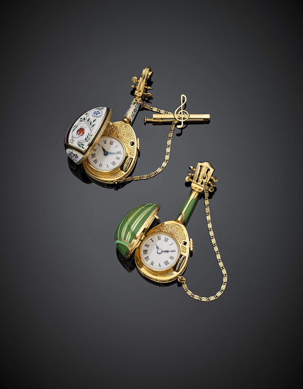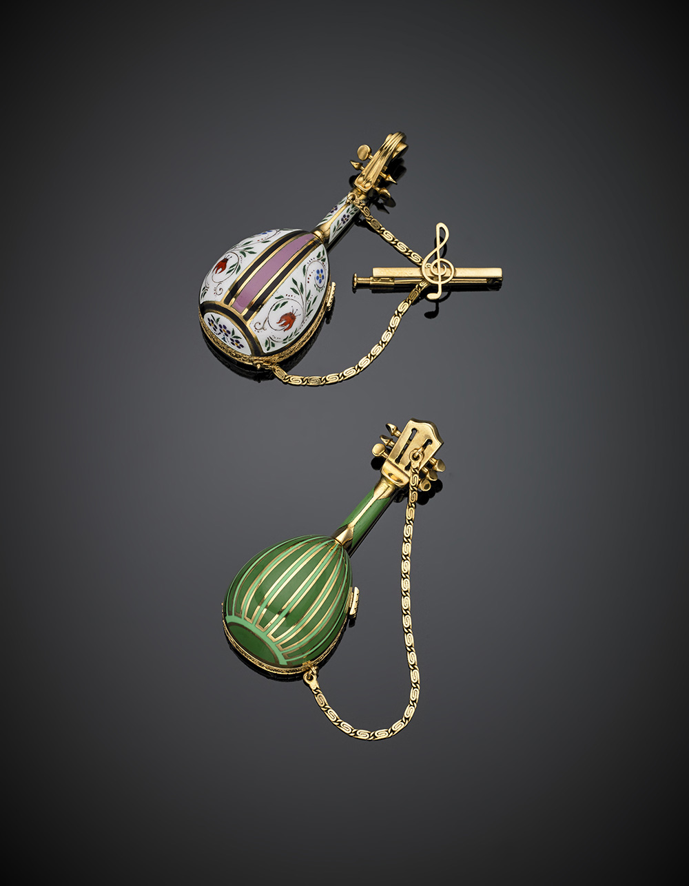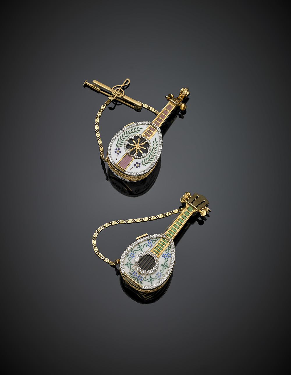 Lotto composto da due spille con pendenti due mandolini gioiello contenenti due piccoli orologi, entrambi rifiniti con smalti e diamanti su oro giallo, ciascuno lungh. cm 5 circa, complessivi g 55,32.