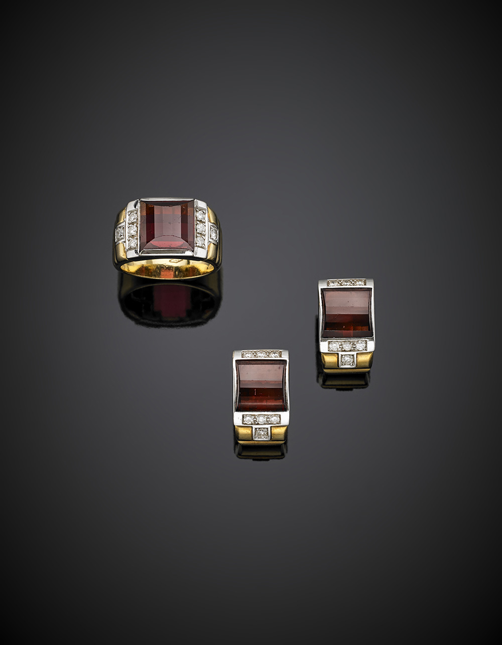 Bi-coloured gold diamond and garnet jewelry set comprising earrings and ring, in all g 26.31 size 14/54.