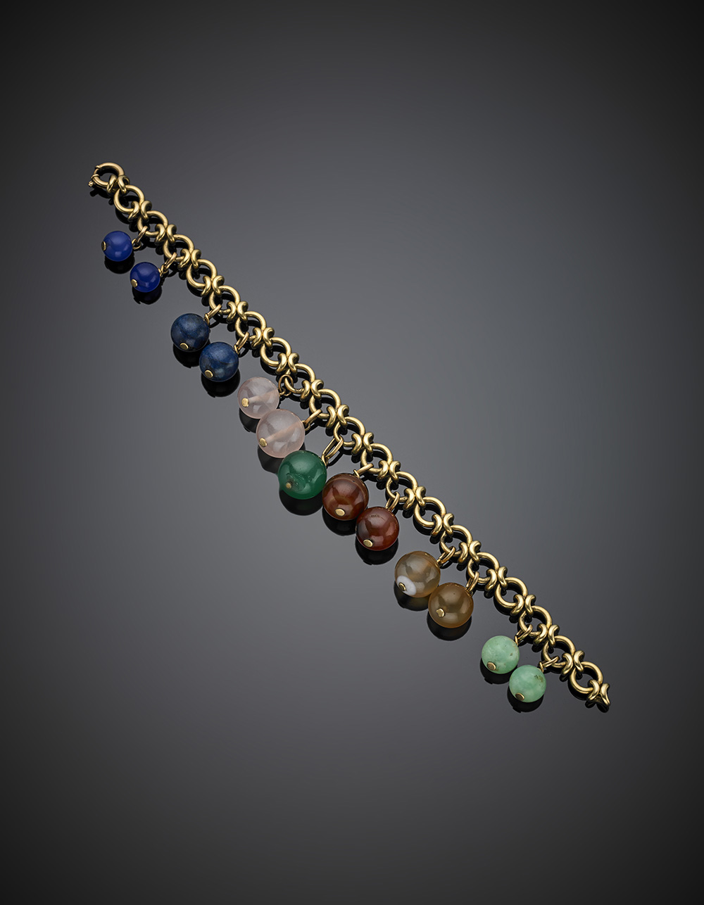 Yellow gold chain bracelet with graduated hardstone bead charms, g 79.38, length cm 22.30 circa.