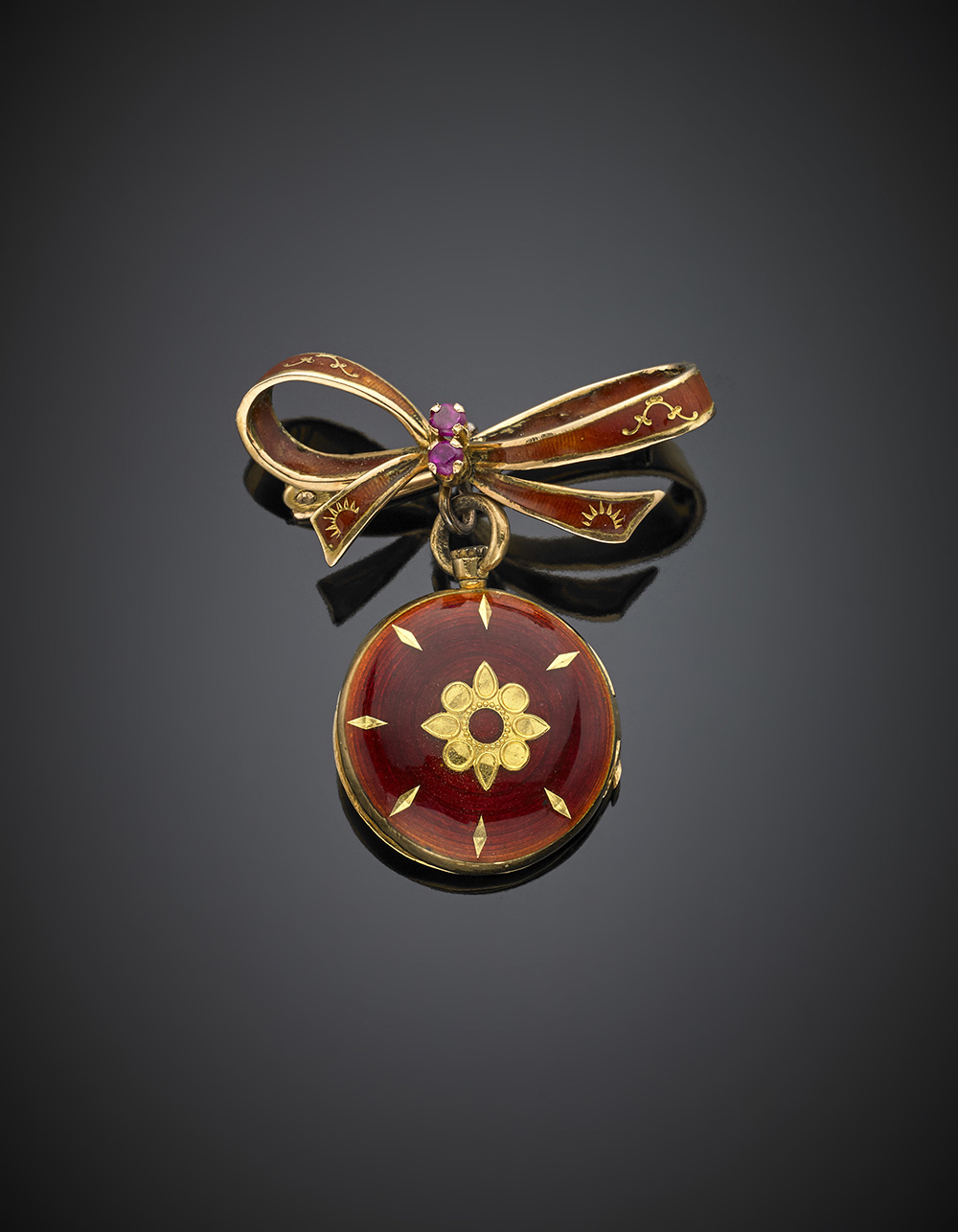 Yellow gold and enamel bow brooch with pendant locket, g 9.22, length cm 3.50 circa.