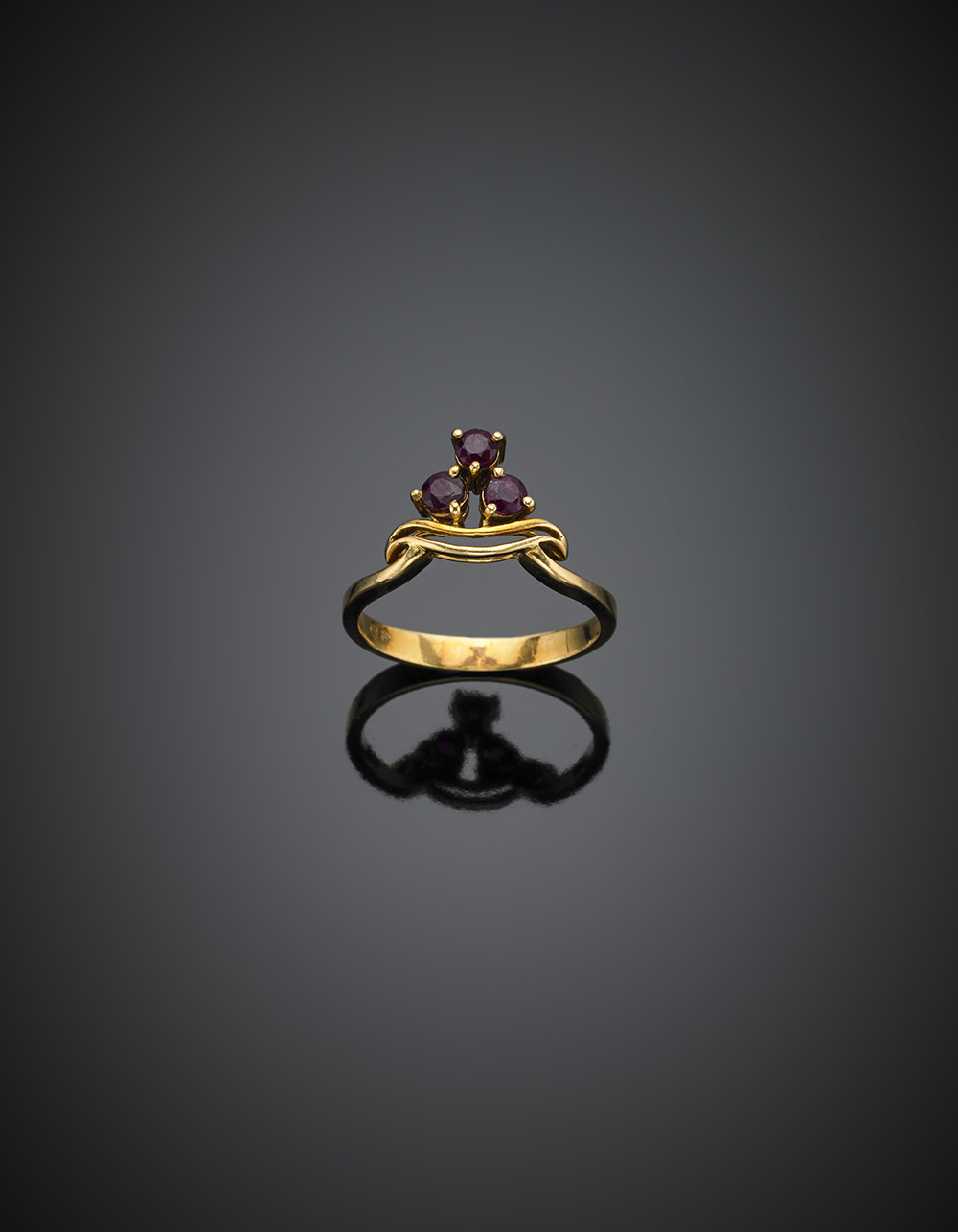 Anello in oro giallo con tre rubini rotondi, g 3,23 misura 16/56.