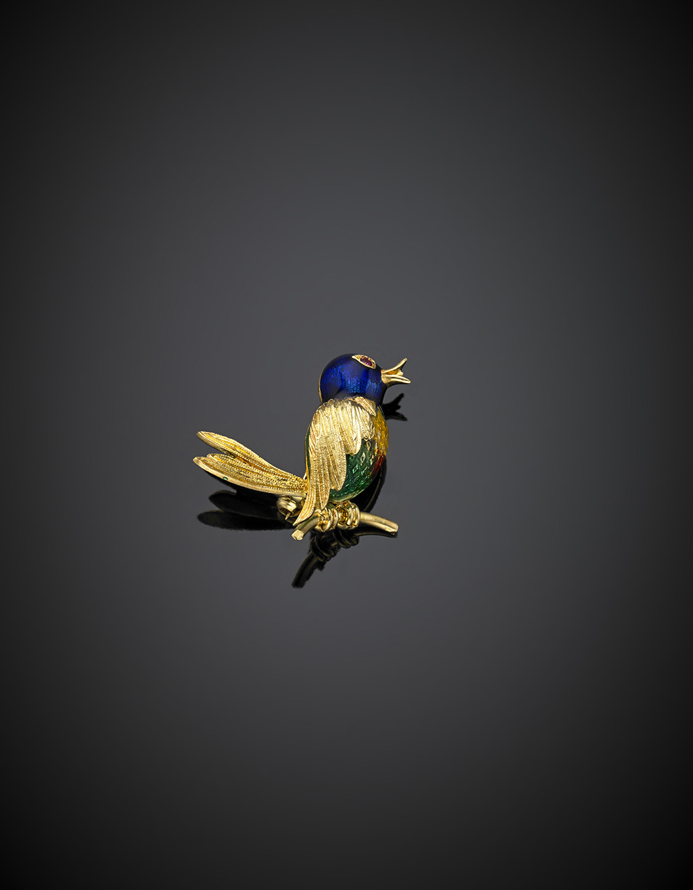 Yellow gold and enamel bird brooch, small ruby for the eye, g 5.63.