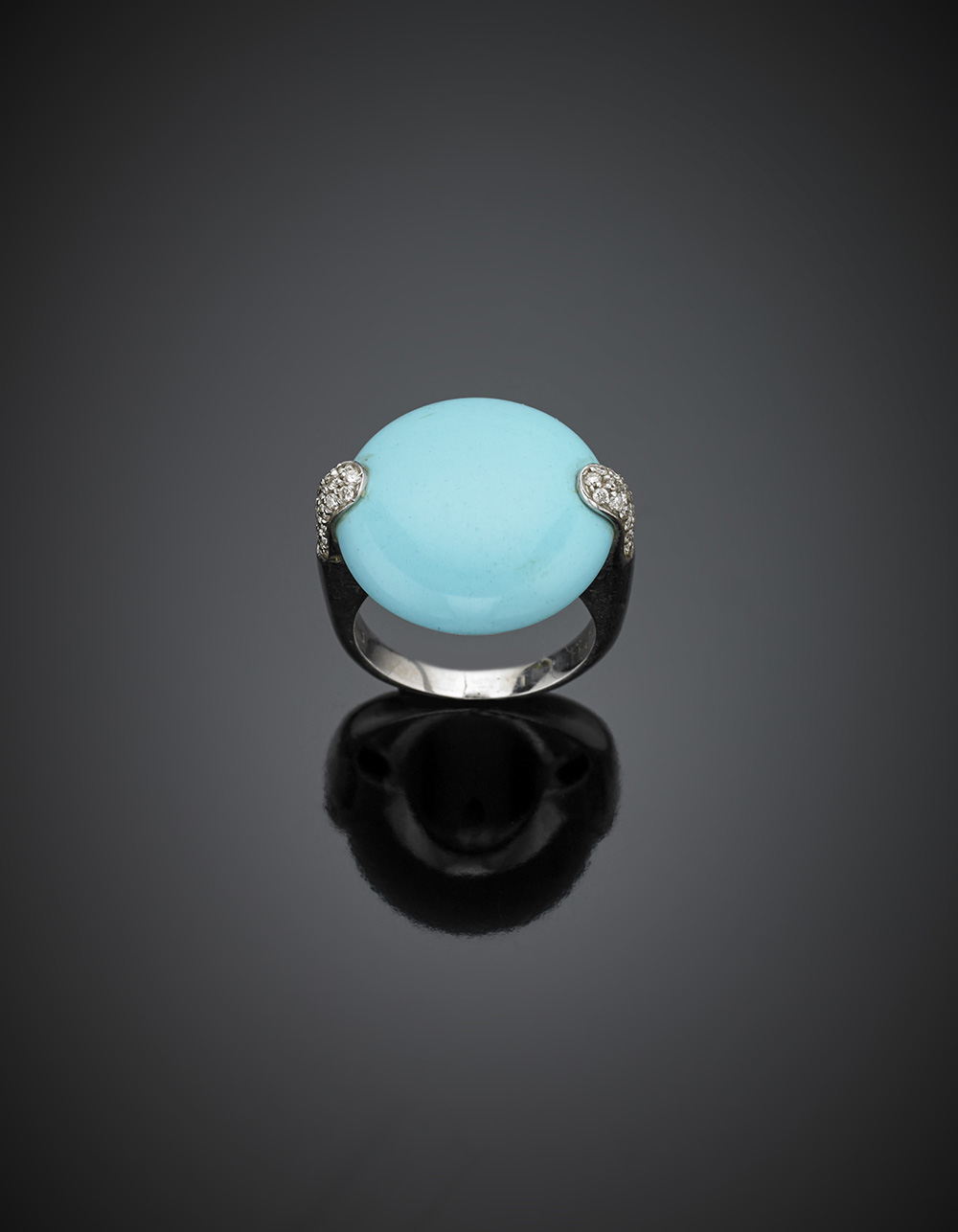 Round cabochon turquoise white gold ring, diamonds on the stem, g 13.59 size 16/56.