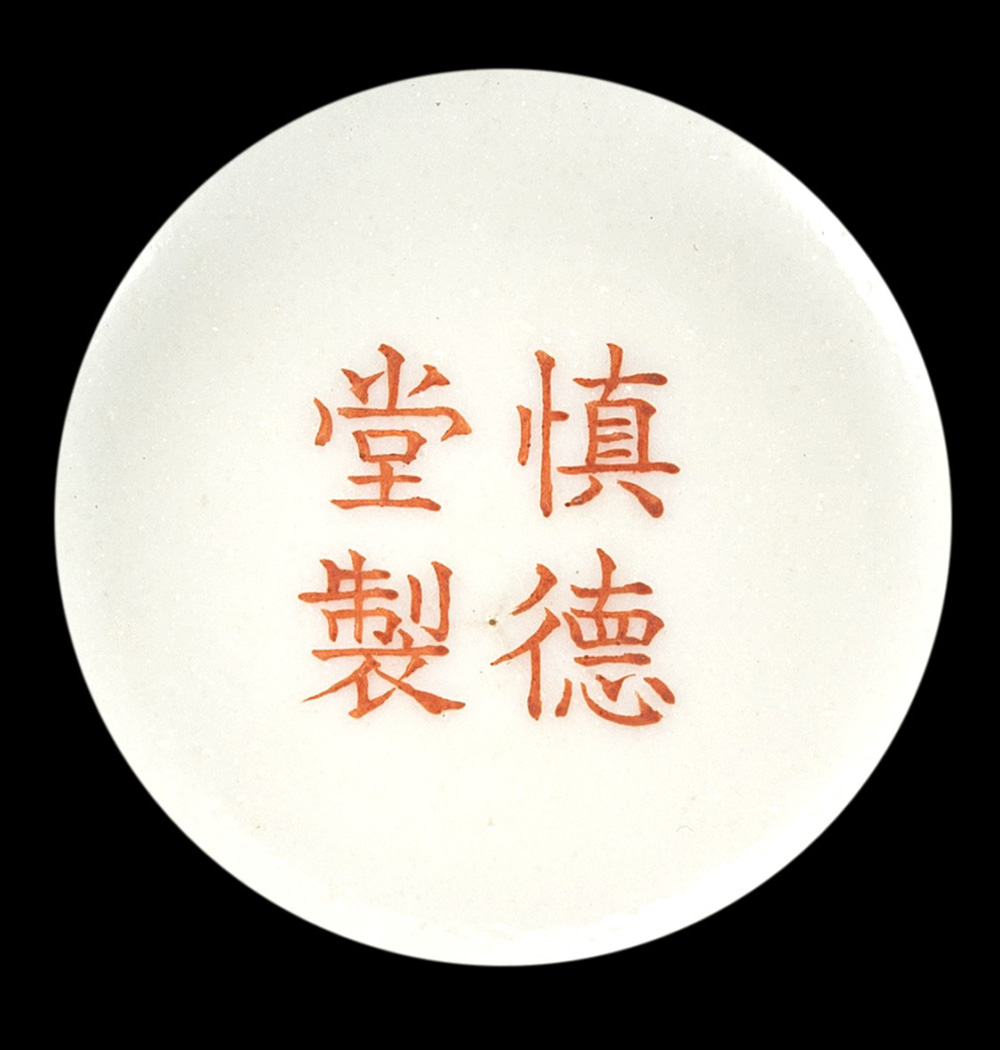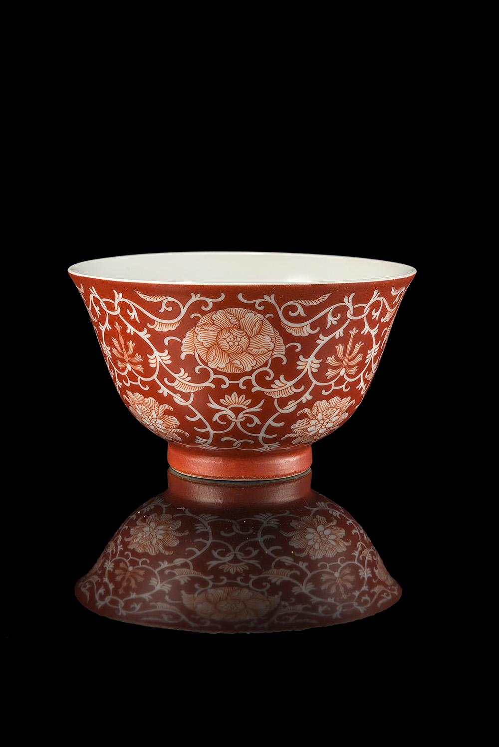 Coppa in porcellana a smalti rosso corallo a decoro floreale in riserva, marchio Shen De Tang Zhi in rosso ferro alla base