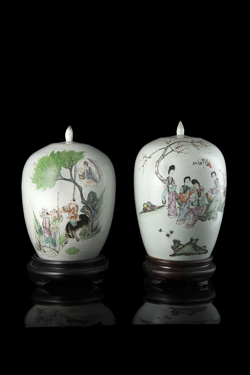 Due potiches con coperchio in porcellana policroma decorate con figure in giardini, basi in legno (difetti)