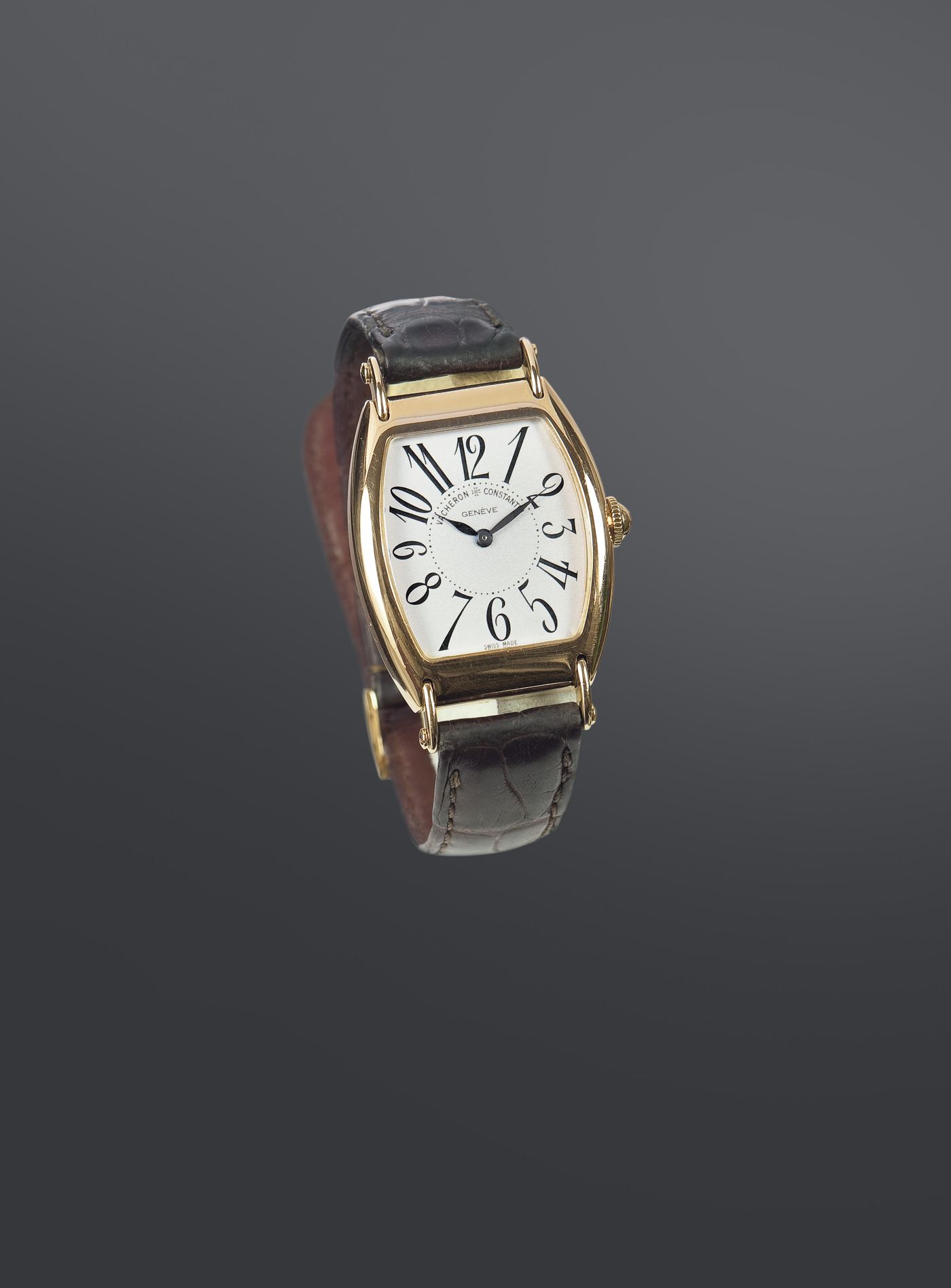 VACHERON & CONSTANTIN Les Historiques 1912, riedizione anno 2000 del modello del 1912 in tiratura limitata e numerata 35x30 Cassa in oro rosa di forma curva tonneau in due parti con anse mobili; quadrante argenté, grené con numeri arabi serigrafati, lancette a foglia anodizzate di colore nero Movimento meccanico a carica manuale calibro 1132