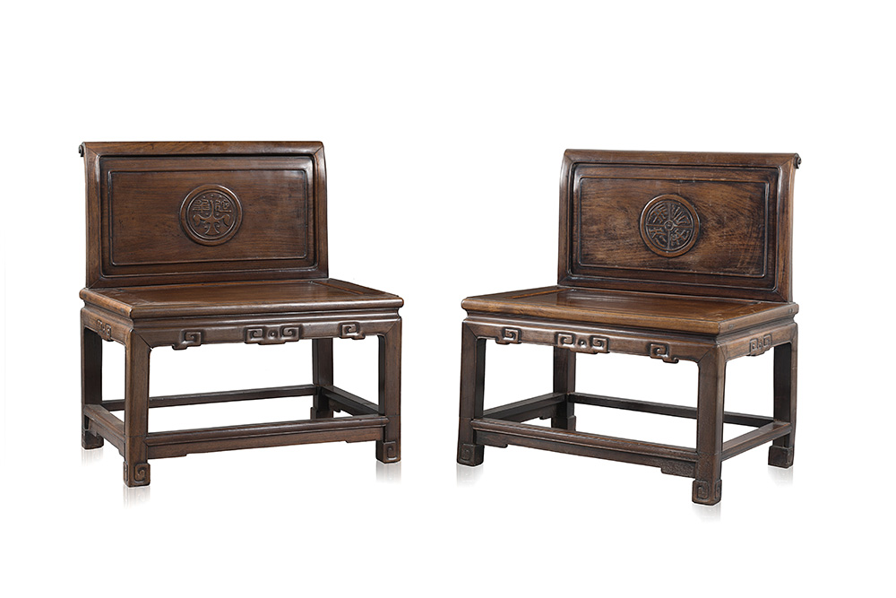 A pair of rosewood chairs with carved circular designs on the back and key fret along the front edge