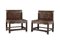 Coppia di sedie basse in palissandro con decoro intagliato sulla schiena e motivi geometrici