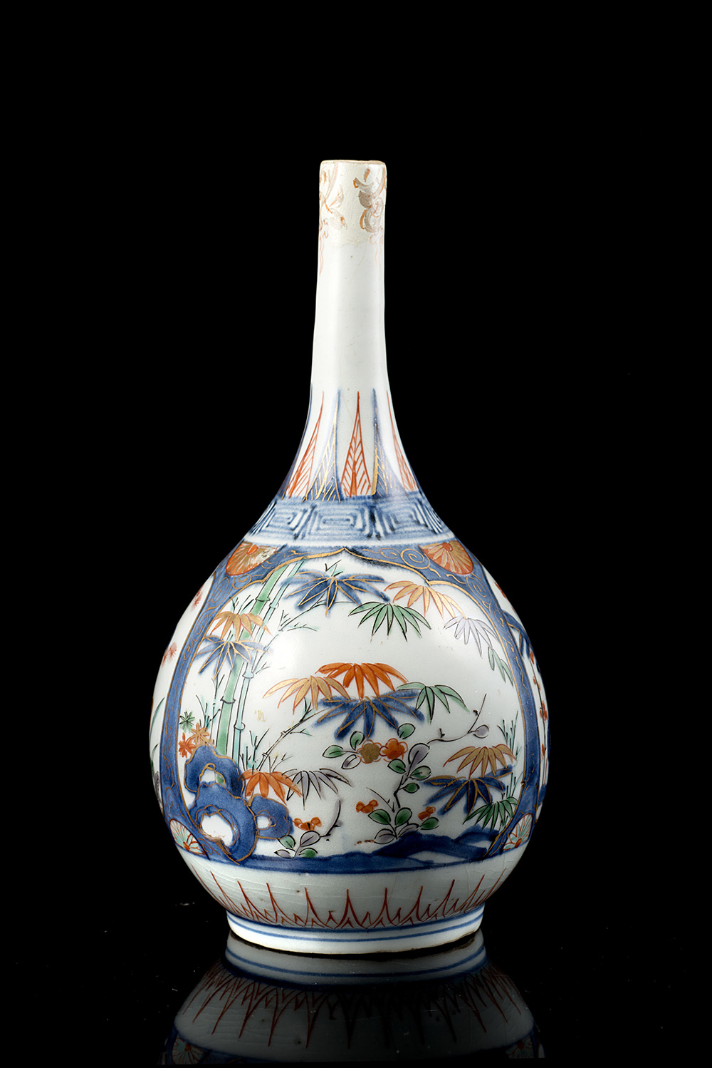Vaso a bottiglia in porcellana Imari decorato a riserve con bambù e rami fioriti (restauri)