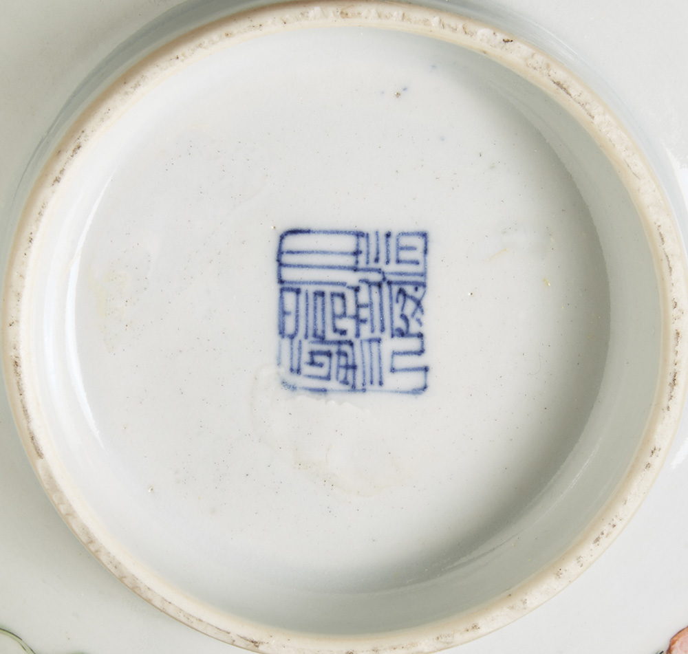 Ciotolina in porcellana con marchio apocrifo Jiaqing, base in legno (difetti)