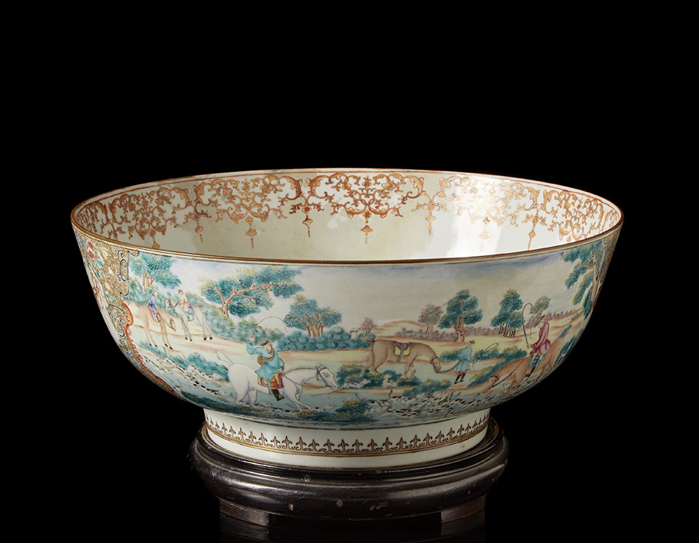Ciotola in porcellana da esportazione Famiglia Rosa raffigurante battuta di caccia, base in legno (difetti e restauri)