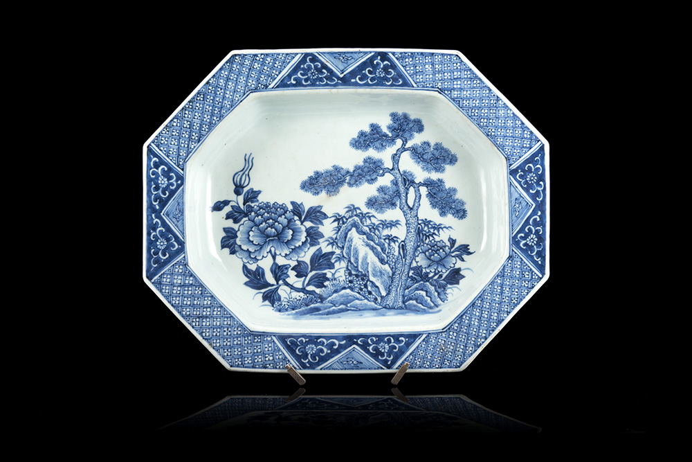 Vassoio bianco e blu ottagonale a decoro florealeCina, secolo XVIII(l. 38...