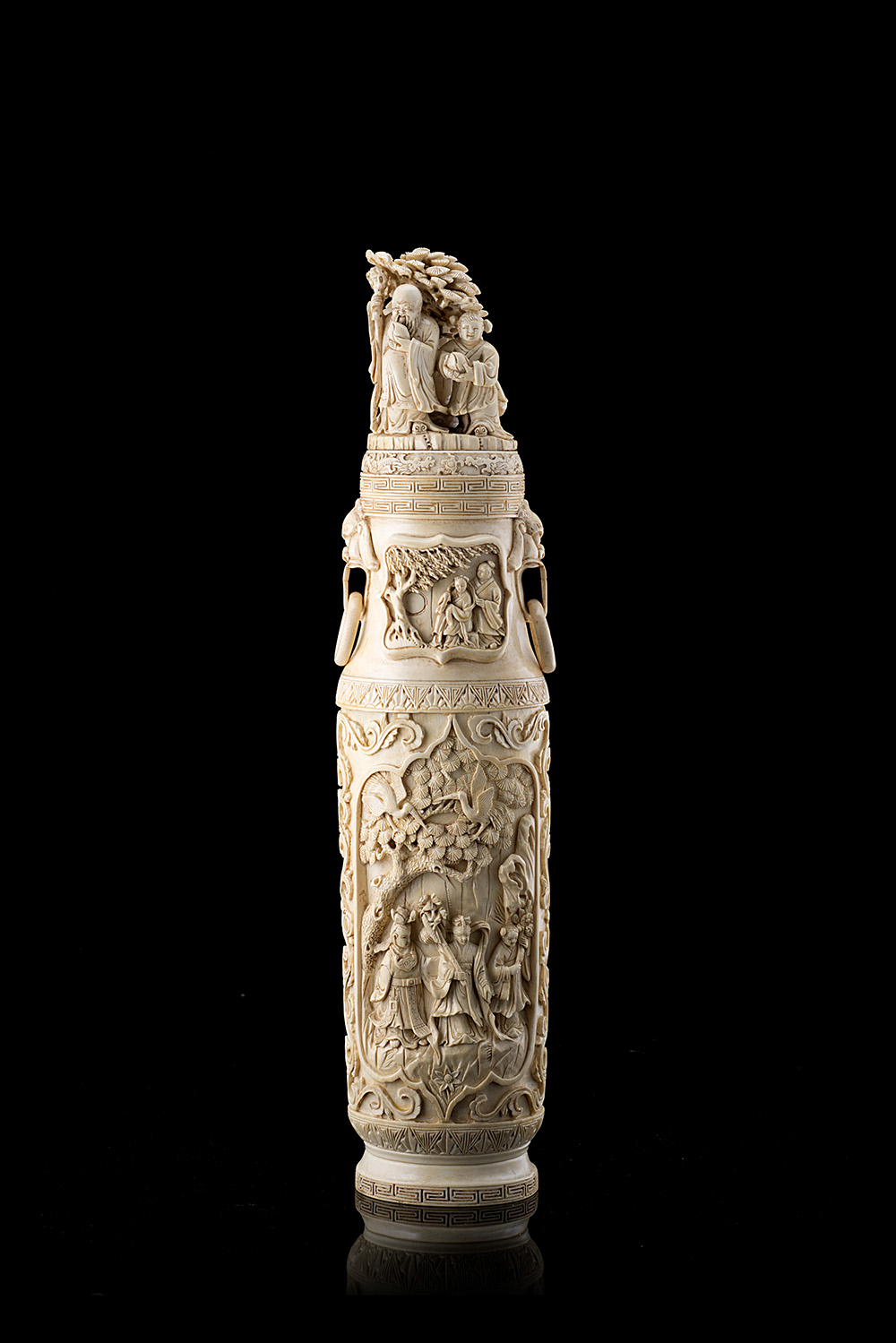 Vaso di forma arcaica in avorio scolpito con anse a mascheroni ed anelli (lievi difetti)