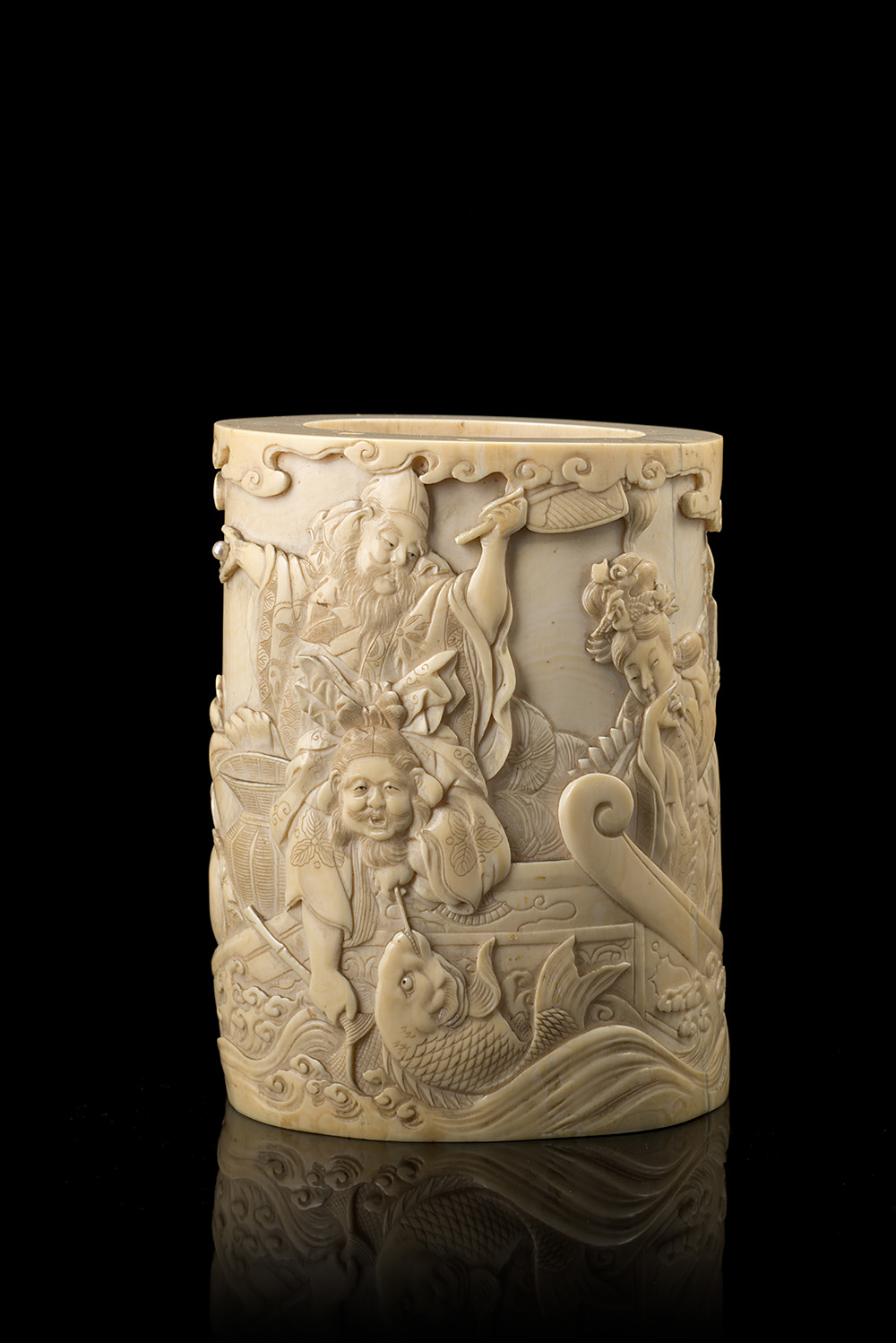 Portapennelli in avorio scolpito con figure leggendarie (difetti)