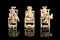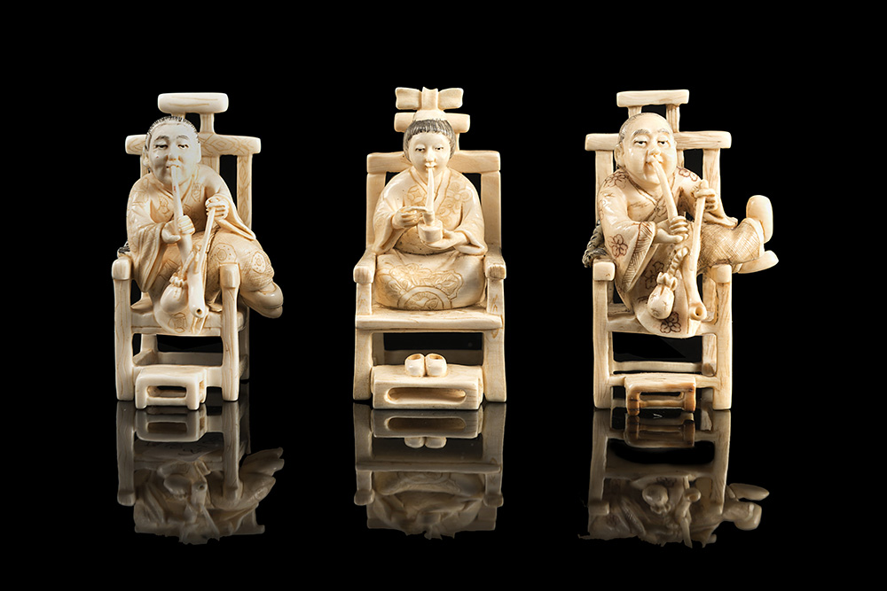 Tre netsuke in avorio di fumatori su sedie, con firme