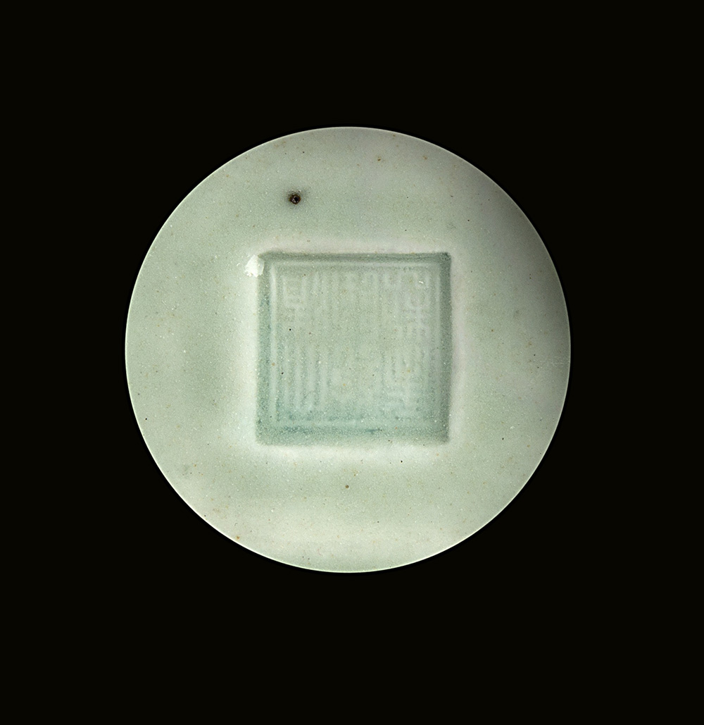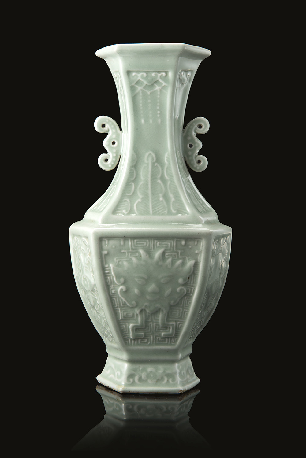 Vaso esagonale a invetriatura celadon con doppie anse a testa di elefanti, con decoro in rilievo e marchio apocrifo Qianlong