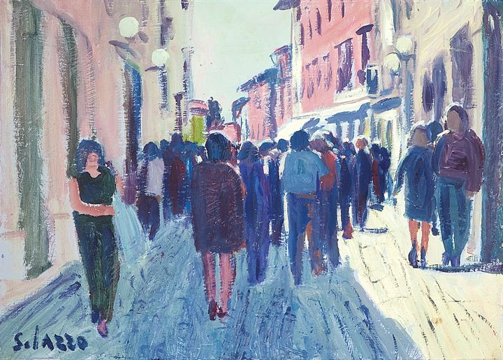 SOLAZZO MARIO Novoli 1944 "Mercato" 50x70 olio su tela Opera firmata in basso...