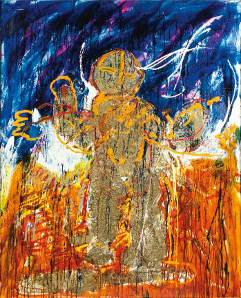 MARIO SCHIFANO Homs 1934 – Roma 1998 BAMBINO IMPIETRITO, 1986 smalto, acrilico e sabbia su tela, cm 160x130. Firmato, datato e titolato al verso: Schifano 86 bambino impietrito. Bibliografia: AA. VV., Mario Schifano, A) II°. Opere su tela 1983 - 1990/97, Fondazione Mario Schifano, n. 86/070, p. 154 (ill.) Opera in corso di archiviazione presso l’Archivio Mario Schifano di Roma