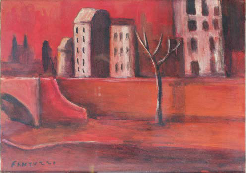 ELIANO FANTUZZI Modena 1909 – Verona 1987 SENZA TITOLO olio su tela, cm 50x70. Firmato in basso a sinistra: Fantuzzi. Iscritto al verso: E’ stato da me dipinto Eliano Fantuzzi. Provenienza: Roma, Galleria Petrarca (timbro al verso);