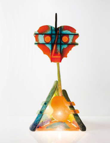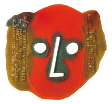 GAETANO PESCE (1939) Lampada “Olo” in resina epossidica multicolore, 2000. La lampada è realizzata in una serie limitata di 100 esemplari tutti diversi fra loro per la Galleria Modernariato di Milano. Firma alla base: Gaetano Pesce NY 2000 81/100. altezza cm 77. Il lotto è accompagnato dall’invito realizzato dall’artista per la presentazione della Lampada Olo presso la Galleria Modernariato di Milano tenutasi in data 4 aprile 2001 (cfr. fig. in alto).