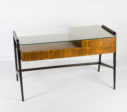 VITO LATIS (1912-1976) Scrittoio a quattro cassetti in legno ebanizzato e rigato con piano in vetro, anni ’50. dimensioni: cm 137,5x 81,5x69