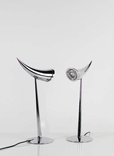 PHILIPPE STARK (1949) FLOS Coppia di lampade “Ara” con asta in acciaio e diffusore orientabile in zamak,1988. Marchiate e datate sotto la base: Flos–Ara–1988. altezza cm 52,5 (ciascuna).