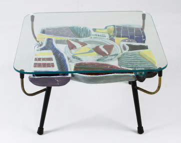 SAN POLO VENEZIA Tavolino con decoro in ceramica policroma raffigurante natura morta posizionata sotto il piano di vetro, anni ’60. Firma sotto la base: “San Polo” Venezia Italy a8p2. dimensioni 60x36x60