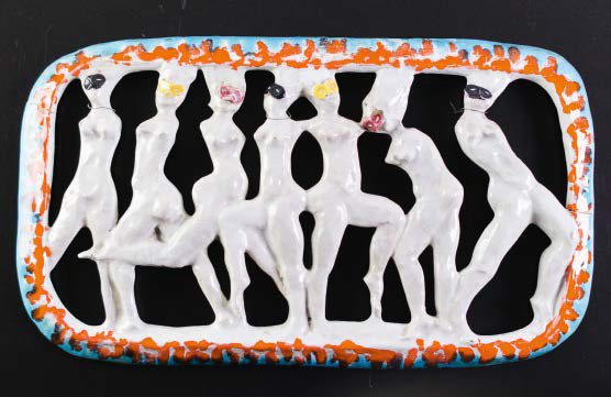 EUGENIO PATTARINO (1885-1971) Grande pannello traforato raffigurante “Danza di donne mascherate” in ceramica policroma, 1950 circa (difetti). dimensioni: cm 39x71