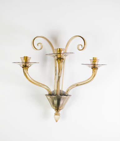 BAROVIER & TOSO Coppia di appliques in vetro soffiato pagliesco a tre bracci,...
