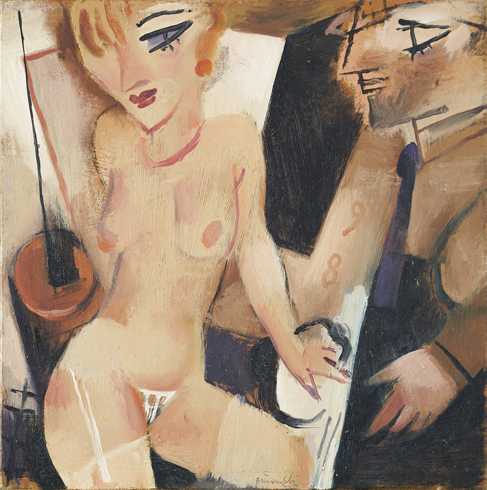 Alberto Manfredi Pittore e modella 1998 Olio su faesite 20 x 20 cm Firmato in basso al centro Titolo, firma, data sul retro Timbro dell'Archivio generale il Mappamondo, Milano sul retro
