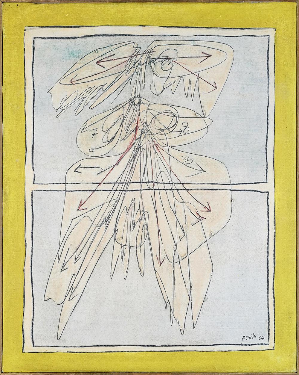 Achille Perilli La bella falsaria 1964 Tecnica mista su tela 50 x 40 cm Firma e data in basso a destra Firma, data, titolo, misure sul retro Etichetta di Rino Costa Arte Contemporanea, Valenza sul retro