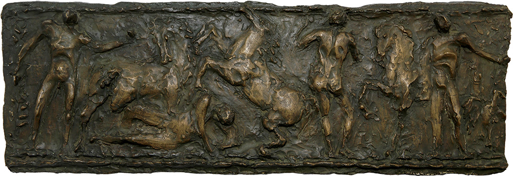 Luigi Broggini Uomini e cavalli (Progetto per grande bassorilievo) 1939 Bronzo fuso a cera persa 30 x 87 x 5.5 cm Firmato in alto a destra Firma a pennello in nero sul retro Etichetta della Galleria d'Arte Cairola, Milano con titolo "Uomini e cavalli/bassorilievo" e "n. 2/93" sul retro Esemplare unico