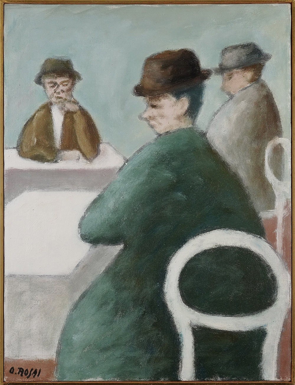 Ottone Rosai Tre uomini seduti (1956) Olio su tela 60 x 45.2 cm Firmato in basso a sinistra Etichetta e timbri raccolta Giraldi, Livorno - Firenze Firmato sul retro da B. Giraldi