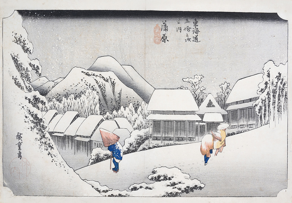 Utagawa Hiroshige Kanbara. Neve di sera (Kanbara. Yoru no yuki) [Stazione 16] 1833-34 Silografia policroma(nishikie) 25 x 36.3 cm Dalla serie Cinquantatré stazioni di posta del Tōkaidō (Tōkaidō gojusantsugi no uchi) Formato: ōban Firma: Hiroshige ga Editori: Takenouchi Magohachi (Hōeidō)