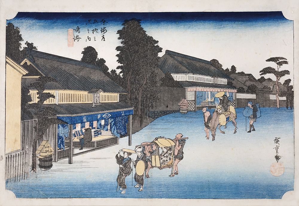 Utagawa Hiroshige Narumi. Celebri tessuti shibori di Arimatsu (Narumi. Meibutsu Arimatsu shibori) [Stazione 41] 1833-34 Silografia policroma(nishikie) 25 x 36.3 cm Dalla serie Cinquantatré stazioni di posta del Tōkaidō (Tōkaidō gojusantsugi no uchi) Formato: ōban Firma: Hiroshige ga Editori: Takenouchi Magohachi (Hōeidō)