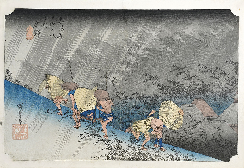 Utagawa Hiroshige Shōno. Scroscio improvviso (Shōno. Hakuu) [Stazione 46] 1833-34 Silografia policroma (nishikie) 25 x 36.3 cm Dalla serie Cinquantatré stazioni di posta del Tōkaidō (Tōkaidō gojusantsugi no uchi) Formato: ōban Firma: Hiroshige ga Editori: Takenouchi Magohachi (Hōeidō) Sigillo di censura: Kiwame sul bordo sinistro