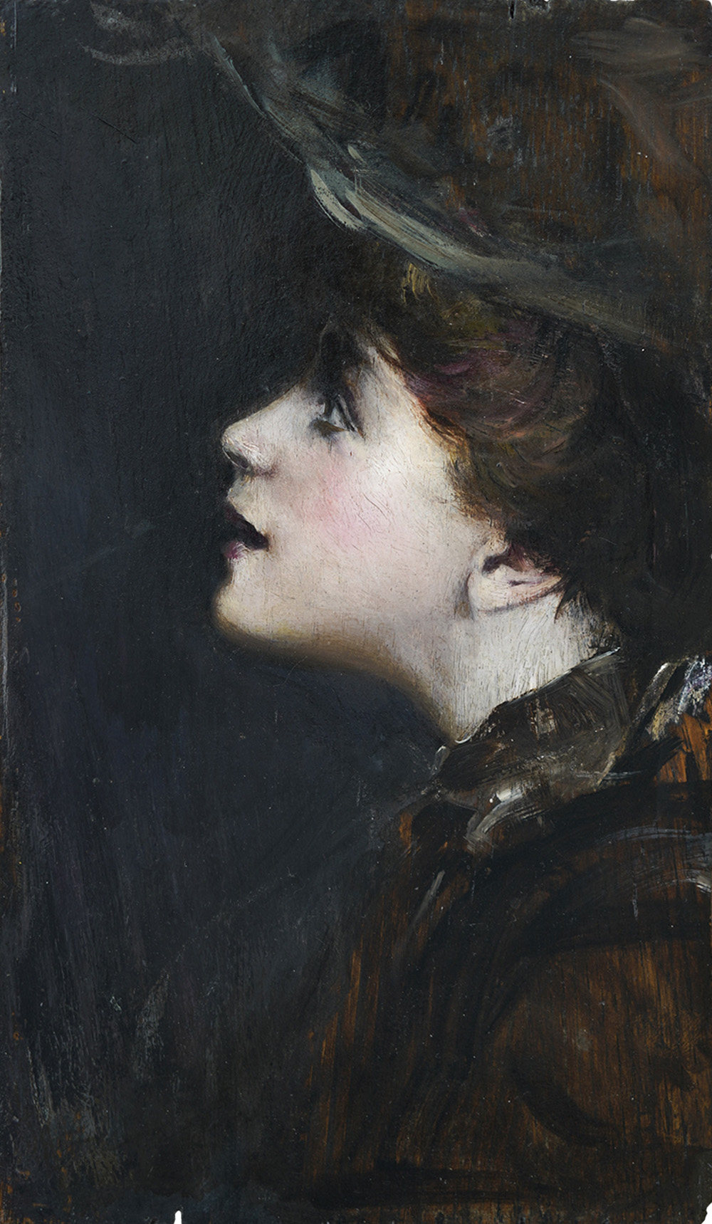 Giovanni Boldini Ragazza con il cappellino 1900 - 1905 Olio su tavola 25 x 14.5 cm Etichetta della Galleria Pesaro, Milano sul retro