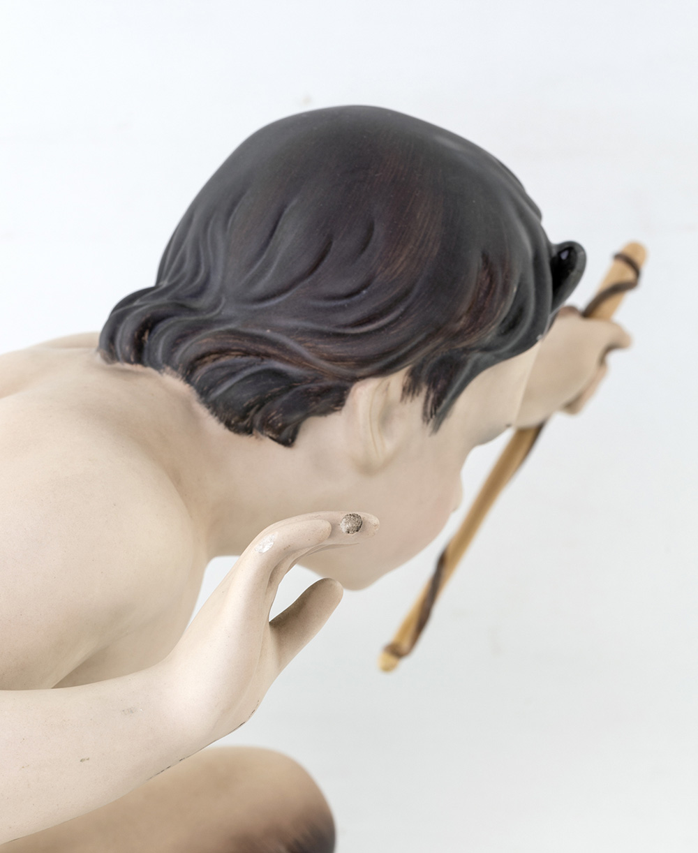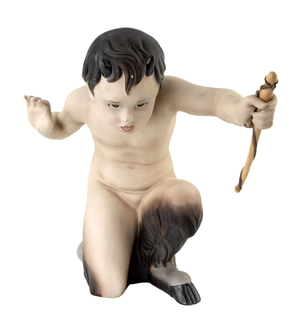 C.I.A MANNA TORINO 1950 ca. FIGURA DI FAUNO con una fionda in mano. Terraglia a colaggio dipinta a mano e all'aerografo, decoro policromo. Marchio sotto la base.altezza cm 35