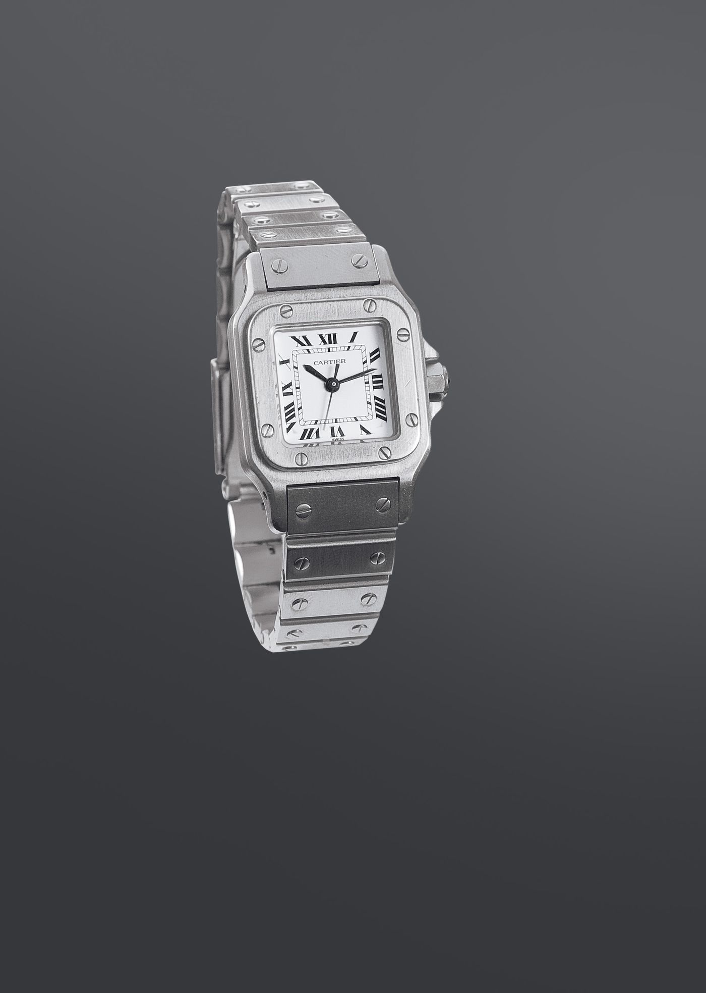 CARTIER Modello Santos, anni '90, misura da donna 24x24 Cassa di forma carré monoblocco, con lunetta serrata da viti; bracciale integrato; quadrante con indici in numeri romani serigrafati e minuteria a binario; lancette a gladio in acciaio azzurrato Movimento automatico