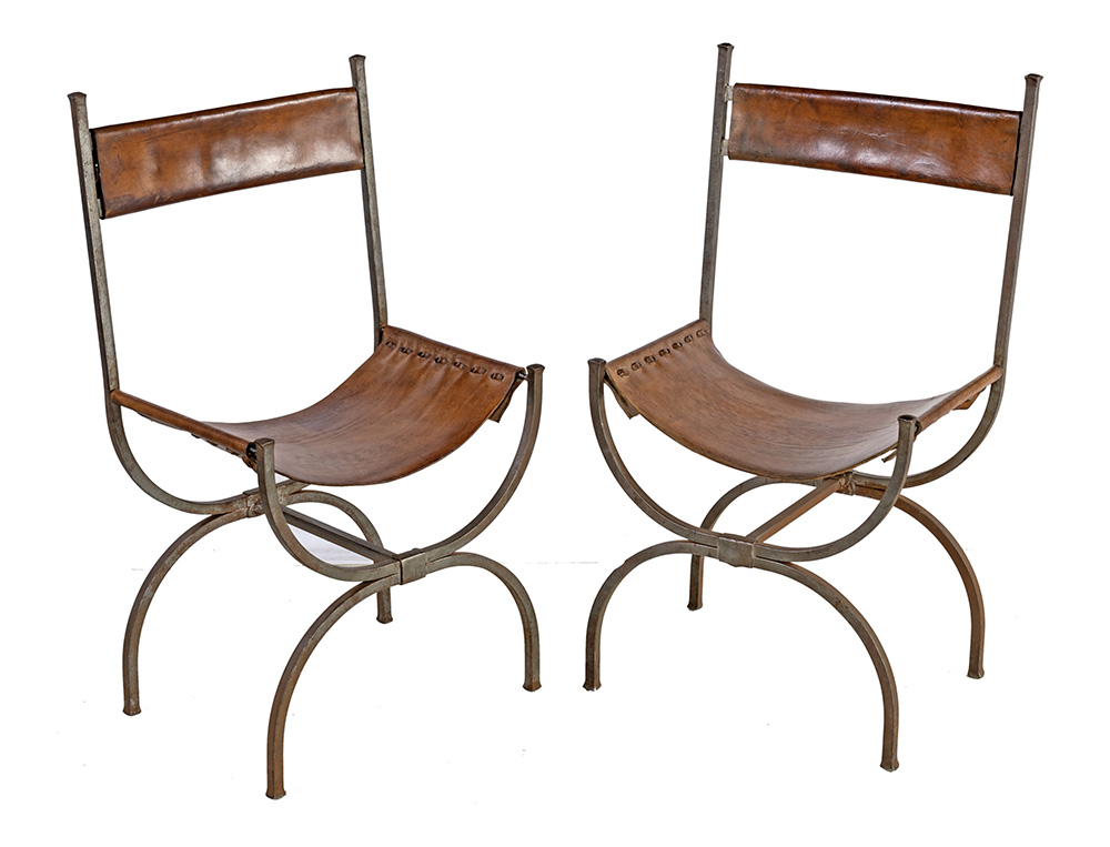 FRANCIA XX SECOLO COPPIA DI SEDIE con struttura in ferro, seduta e spalliera in cuoio, manifattura francese 1970 ca., cm 86x47x35