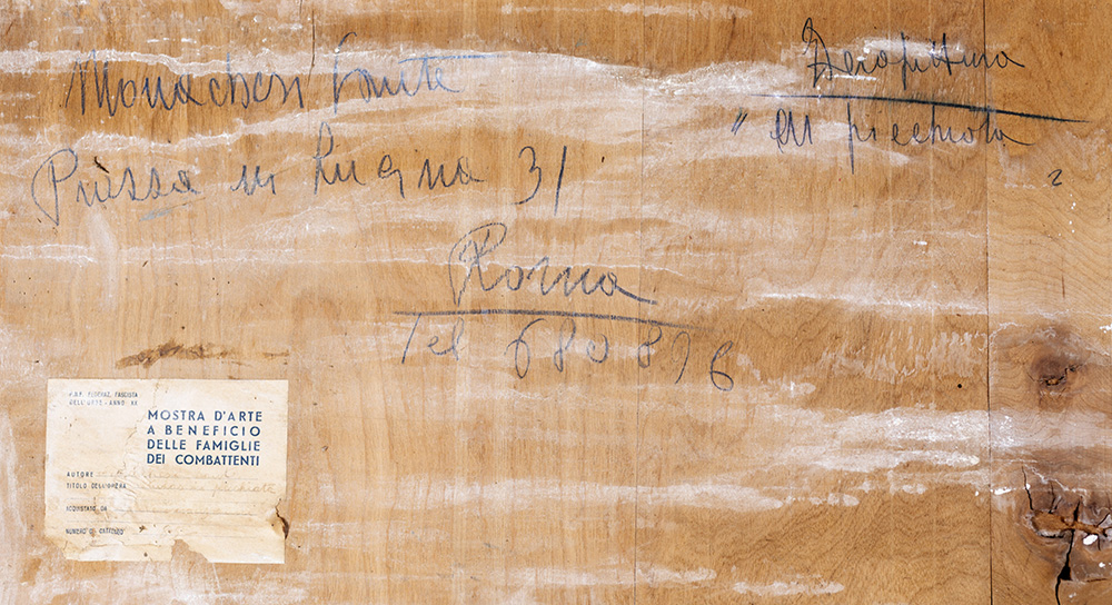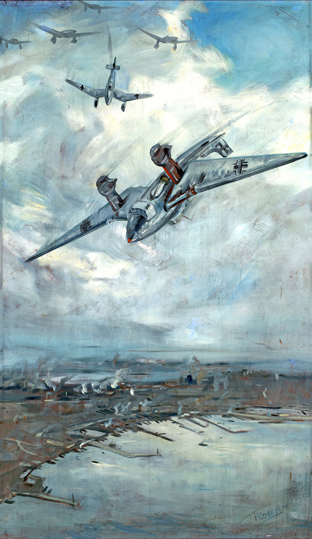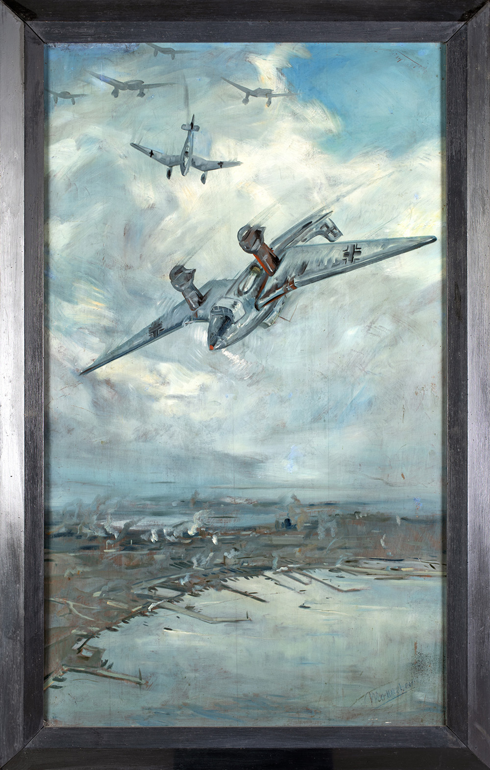 SANTE MONACHESI (Macerata 1910-Roma 1991) AEREI IN PICCHIATA olio su tela, cm 150x90. Firma "Monachesi" sul fronte". Opera realizzata nel 1941. Sul retro reca cartiglio della "Mostra d'Arte a Beneficio delle Famiglie Combattenti". Esposizioni: Sante Monachesi, Fondazione Roma Museo, Roma 2010. Pubblicazioni: Sante Monachesi, a cura di Stefano Papetti, Ed. De Luca Editori D'arte, Tav. 31. Provenienza Collezione Privata. Si ringrazio l'Archivio Sante Monachesi a cura di Luce Monachesi per aver confermato l'autenticità dell'opera.