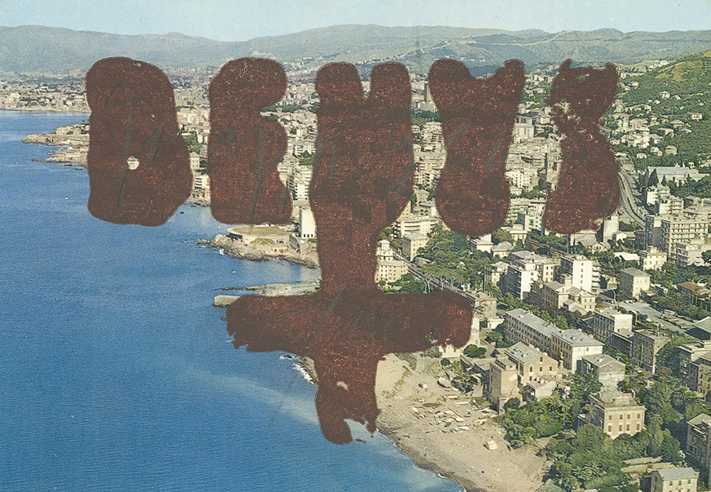 Joseph Beuys (Krefeld 1921 – Düsseldorf 1986) Genova, 1976;Panorama aereo, cartolina a colori di Genova con “Braunkreuz”, 10 x 15 cm