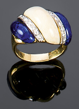 ANELLO Anello in oro giallo con sommità in smalto blu, avorio e due file di...