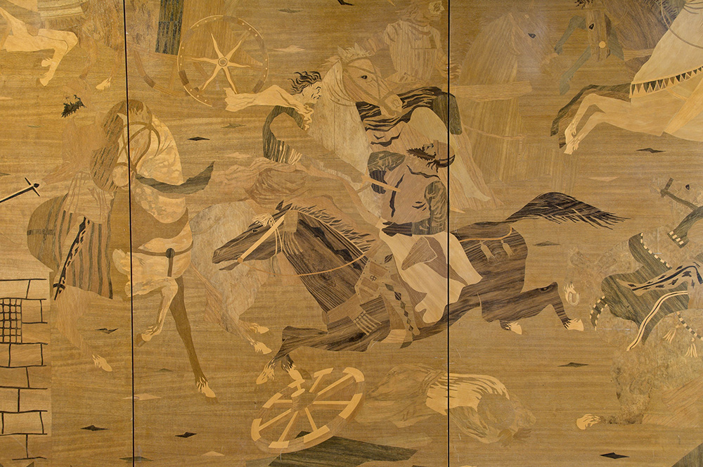 Luigi Scremin Pannello ad intarsio raffigurante Castel Tirolo e scena cavalleresca;5 pannelli a intarsio in legno, 255 x