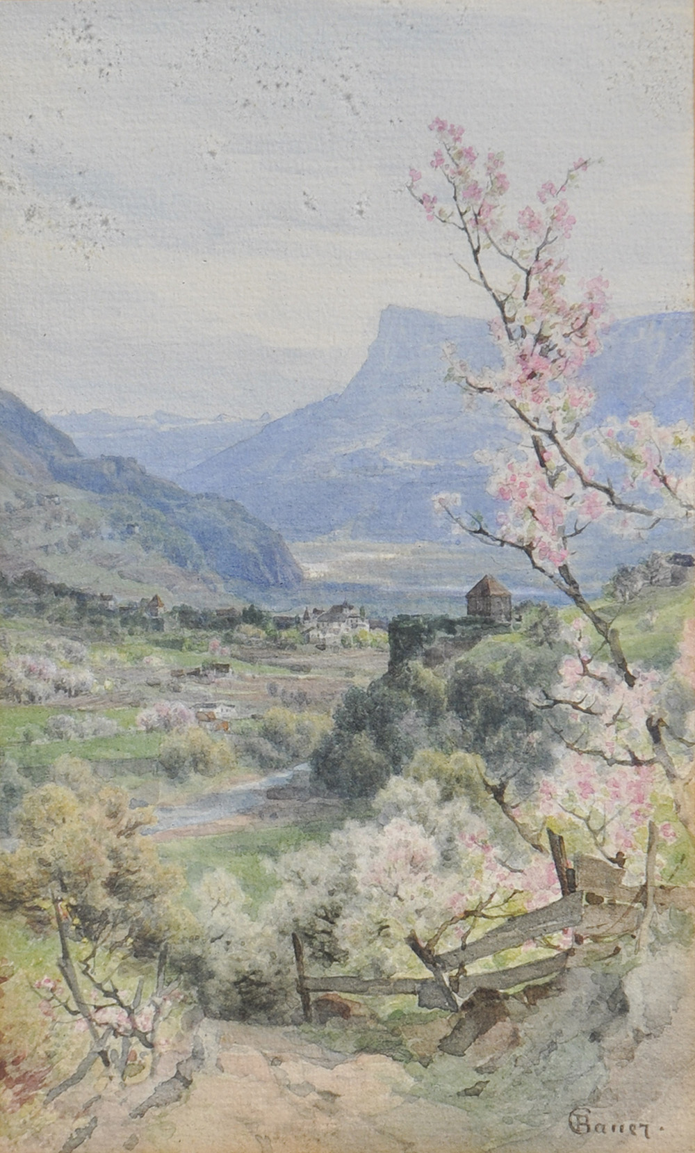 Gustav Bauer Vista sulla Valle dell’Adige verso Monte Macaion, 1894;Aquarell, 25,5 x 15,5 cm, gerahmt