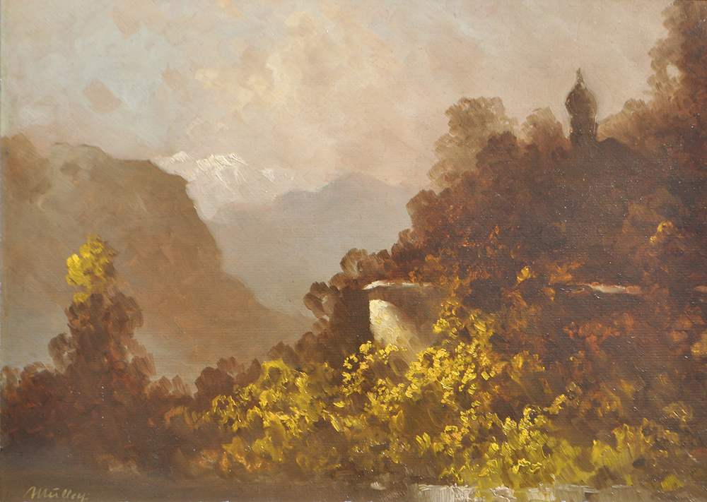 Oskar Mulley Paesaggio autunnale, 1945 ca.;Olio su cartone, 32,5 x 45 cm, in cornice